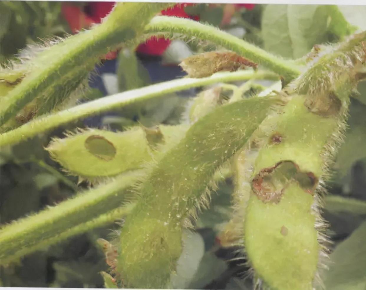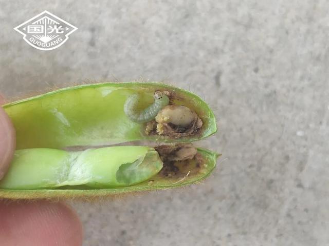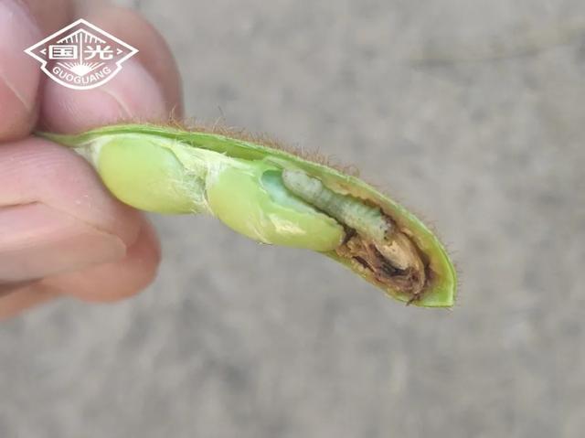 幼虫入荚前使用药剂进行防治,可选择的药剂有国光博杀特、毒箭等,喷药时应将喷头朝上从大豆植株根部向上喷施,使下部枝叶和顶部叶背面均能附着药液,确保防治效果;