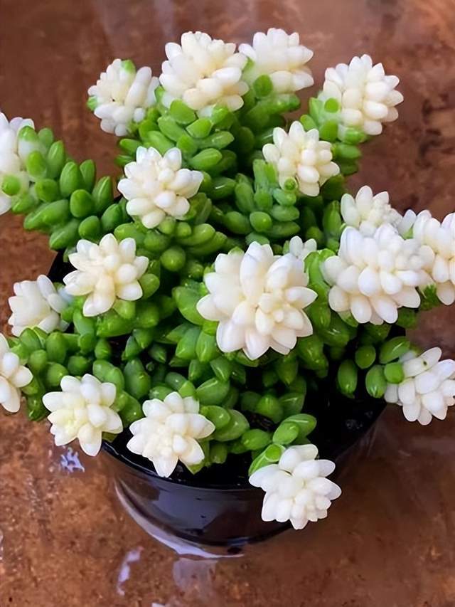 玉坠一般都是全绿的,喷了药以后,顶端新长的叶子变成白色,就成了玉坠锦,相对于纯绿色,颜值确实提升了。不过后续顶端容易枯萎,掉叶子,算是副作用了。