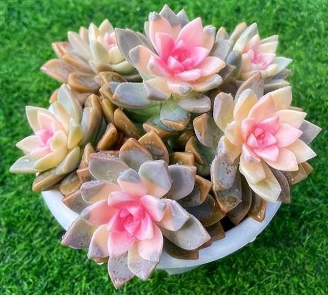 把樱花锦放在第一位是因为这个是新手最容易被它颜值吸引入坑的,也是药锦多肉里最容易死的。它是淡雪喷了药形成的,虽然淡雪很皮实,但做成樱花锦需要药量很大才会呈现粉白的颜色,后期养护难度较大,很容易掉叶腐烂。