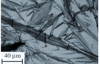 片状马氏体(针状马氏体):在高碳钢中,凸透镜片状的马氏体在光学显微镜下展现出针状或竹叶状形态,其马氏体片并非平行排列,而是被残余奥氏体所环绕。这些马氏体的亚结构以孪晶为主,边缘区域富含高密度位错。特别地,孪晶结合处形成的带状薄筋被称为中脊,该中脊区域富含高密度的微细孪晶,因而又被称为孪晶型马氏体。
