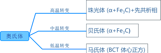 在铁碳合金的凝固过程中,实际生产往往处于非平衡状态,此时存在一定的过冷度。随着过冷度的不同,钢中的奥氏体会发生不同的转变。当过冷度较小时,奥氏体会进行接近平衡状态的珠光体转变;而随着转变温度的进一步降低,则会引发贝氏体转变和马氏体转变这两种非平衡转变。