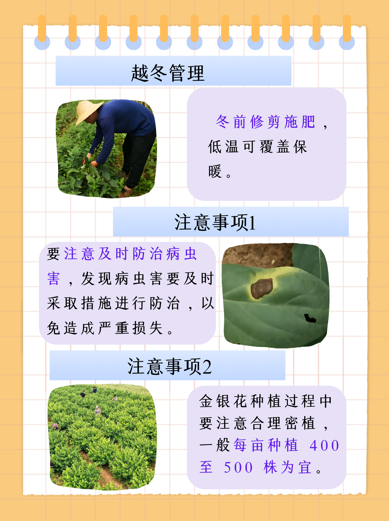 1.金银花种植过程中要注意合理密植,一般每亩种植 400 至 500 株为宜。