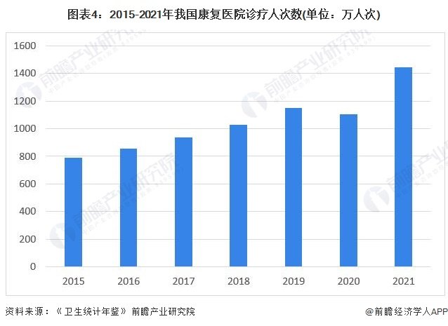 随着我国居民对诊疗过程中康复医疗重要性认知的不断加深以及医疗服务供给的不断丰富,我国康复医疗诊疗人次数稳步提升。根据《卫生统计年鉴2022》的数据,2014至2021年间我国医疗卫生机构康复医学科床位数由约13.8万张增长至约32.7万张,与此同时,2015年至2021年我国康复医院诊疗人次数由2015年的789.9万人次,至2021年提升至1441.8万人次。