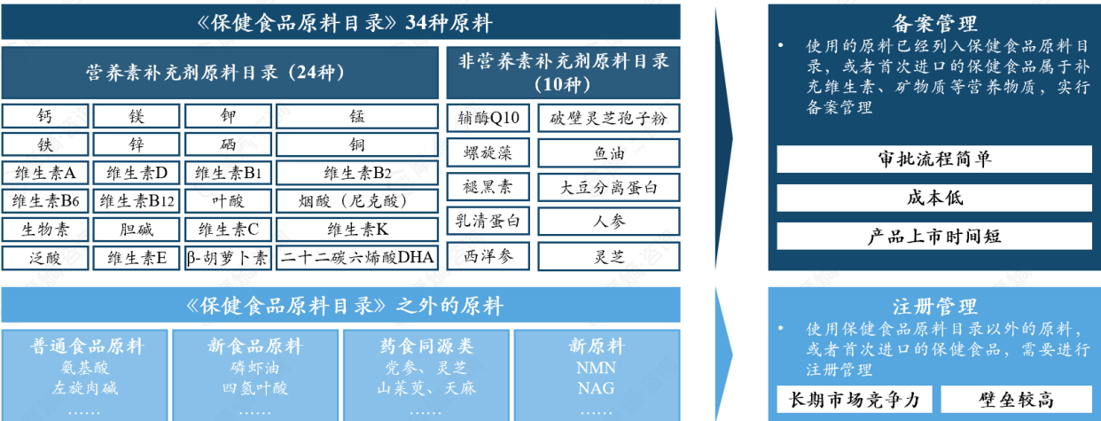 我国《保健食品原料目录》包含 34 种原料,分为 24 种营养素补充剂和 10 种非营养素补充剂;保健品也可添加目录外原料,如药食同源类、新原料 NMN 等。若仅使用目录内 34 种原料,按备案制管理,审批流程简单、成本低、上市快;若使用目录外原料,则需经注册审批,需通过更严格的安全性评估,流程复杂、成本较高,但能形成更高技术壁垒,具备更强长期市场竞争力。