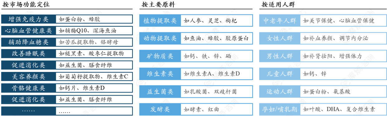 按照市场功能定位,可分为增强免疫力、改善健康、改善睡眠、促进消化、美容养颜等多个类型,有胶囊、片剂、口服液、粉剂、科技、软糖等多种产品形态。按照主要原料,可分为动植物提取类、矿物质类、维生素类、益生菌类、发酵类等。按照适用人群,可涵盖中老年健康养护、青年养生抗衰、儿童成长营养,以及运动人群、孕哺女性等需求场景。